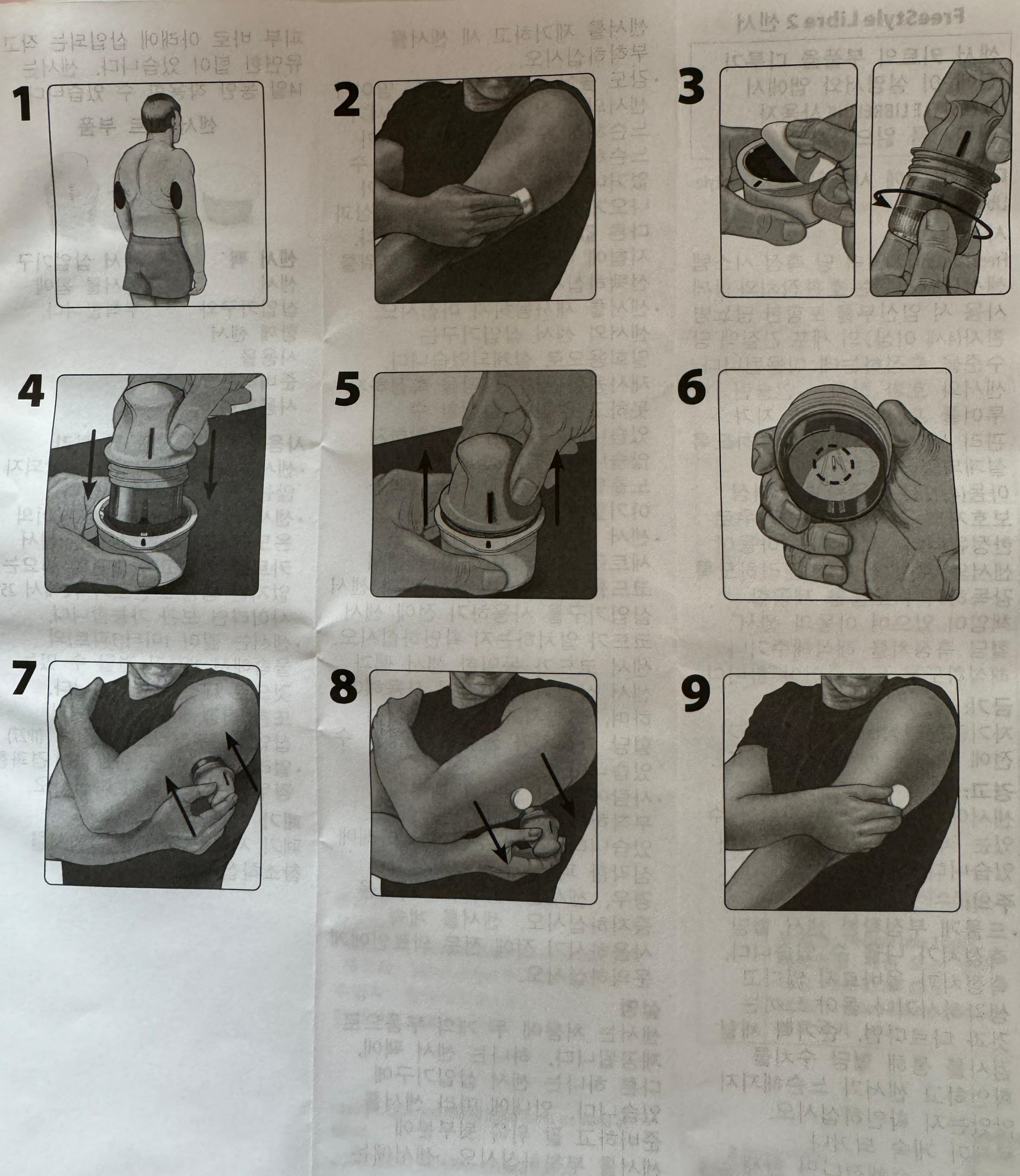 리브레의 기술은 팔 뒤쪽에 부착하는 것으로 허가가 났기 때문에 1번에서 말하는 부위에만 부착을 해야합니다.