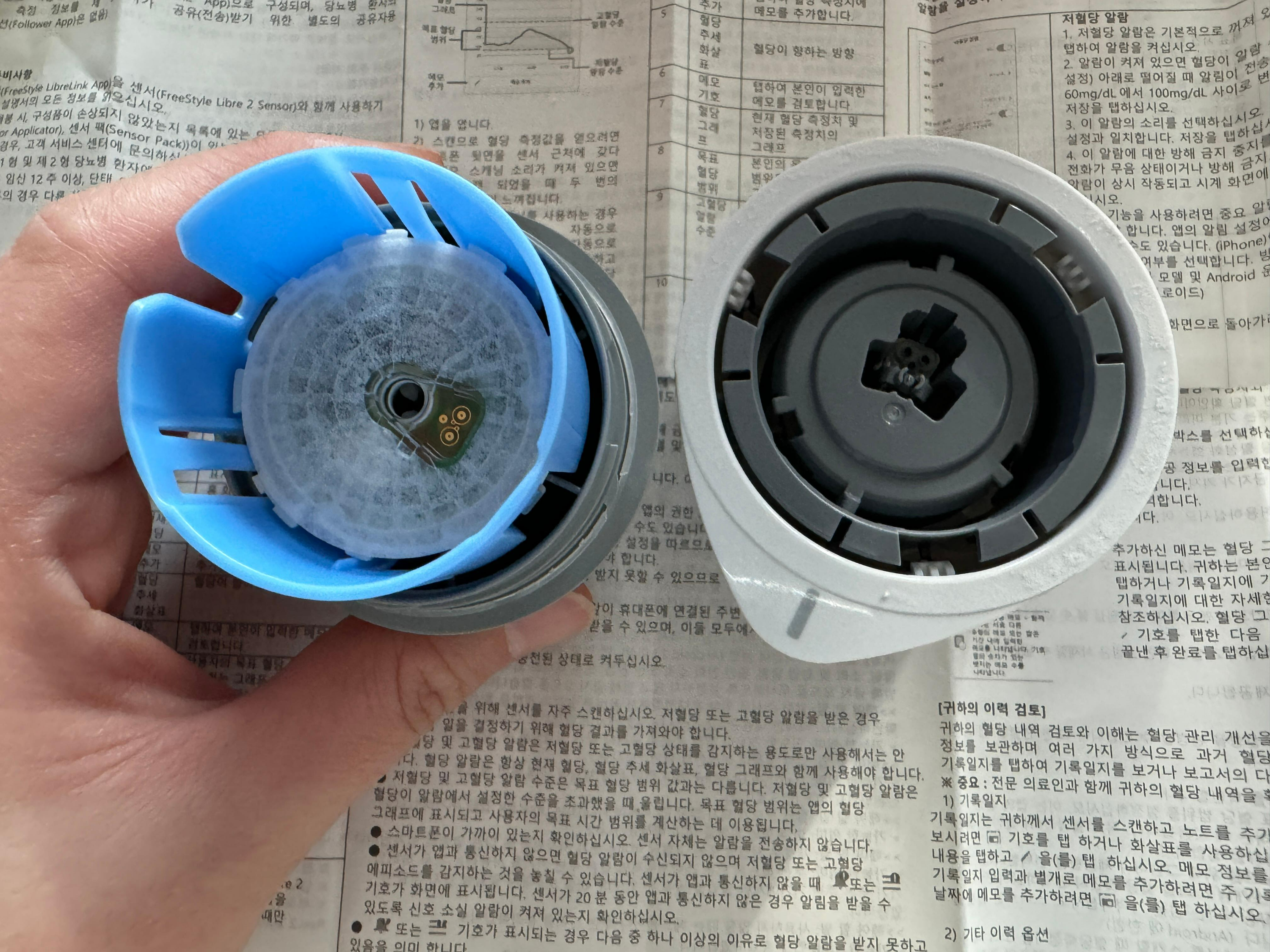 그리고 왼쪽의 센서팩 뚜껑을 열어줍니다. 오른쪽의 센서 삽입기의 경우 아래 보호 캡을 열어줍니다.